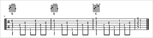 一般常用开放和弦的有 C, G, D, A, E调及其关係调。首先我们以G调配合三指法为例子。当 G和弦进入到 C和弦时,它的标准进行如下: