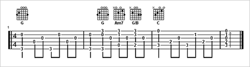现在我们修改第二小节,让它有变化。其实说穿了当G调的 G和弦〈Do, 1〉进入到 C和弦〈Fa, 4〉过程中,我们想办法补进音阶如 Do, Re, Mi, Fa 或 Mi, Fa, Sol, La。再加以添入和弦连接即可。如下: