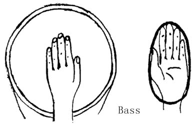 Bass:djembe 的低音。要打出 bass 音切记不要很刻意用力重击鼓面,手要轻松柔软,掌面持平,否则不是产生不该有的杂音,就是会使 bass 音不自然的断音。肩颈放轻,手臂外伸,手肘微微往身体内弯,手掌和前臂成一直线,手指自然伸直,大拇指外张,拍打鼓面时要干脆不拖泥带水,手掌拍击鼓面后立即弹起。拍击的位置大概是整个手掌 ( 除大拇指外 ) 能在鼓面内缘即可,不用力求掌心非得拍击鼓面中心点。每个鼓的特性不同,不同的手法及击点都会产生不同的音,所以只要你打出的 bass 音满圆润,大概就没错了。