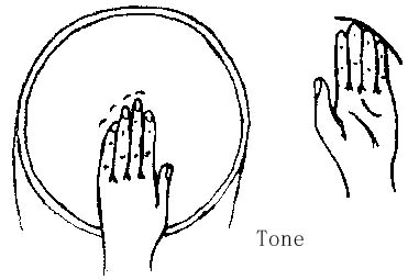 Tone:djembe 的中音。打 tone 音的时候,打法基本上跟打 bass 的打法差不多,不过打在鼓面的位置是不同的,所打的位置是在鼓面的边缘,以手指和掌心的交接线贴近鼓面的边缘,而且大拇外张,其余四指并拢。也和打 bass 时一样,要干脆,四指指腹切实击在鼓面上,一接触后,立即弹起,就像触摸到一个火烫的火炉一般。