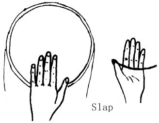 Slap:djembe 的高音。打 slap 音和 tone 音的位置几乎是一样的,都是在鼓面的边缘,但是四指自然松开,与手掌部位形成自然弯曲 ( 有老师没强调这点 ) ,由外而内稍带角度 ( 另有老师认为直上直下即可 ) ,以手指和掌心的交接线,打击鼓面的边缘,让指端迅速地敲打在鼓面上,而发出钟声般的声音。 Slap 这个音的手法有比较多的不同论述,以 mamady 及 famoudou 来讲,就有所不同,不过相同的是他们打出的 slap ,就是「猛」、「清脆悦耳」、「声音大港」,我想能打出那种声音的手法,就是正确的手法。