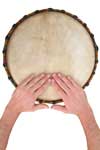 ● 低音——手指并拢在一起或是稍有一点距离,让整个手拍击鼓的中间部位并且立刻自然收回。做这个动作时手腕要结实,不要把手成杯状,也不要用拳头去击打鼓。根据djembe的规格不同,确切的鼓的中心部位可能是一个中心点,或是一个“死点”,所以要练习稍稍偏离中心的低音。为了更快的练习一个纯正的低音,就要把手向着鼓的中间移动,直到手掌部位穿过中心边缘。