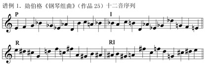 勋伯格的《钢琴组曲》(作品25)体现了高度的形式理性,该作品用于创作的音列有四种(谱例1):分别是原音列(P),音列的转位(I),音列的逆行(R),音列的逆行转位(RI),根据这四种音列作成的乐曲片段,几个声部作卡农式的模仿或反行模仿,这是一首无调性的十二音音乐。十二音音乐以数学的方法对音符进行科学运算,它是基于数理逻辑与理性化的一种无调性的技术手法,并且按照一定逻辑去排列,以一种极端理性化的形式出现,它后来发展成为序列主义音乐,序列主义音乐把对音级的序列安排和控制扩展到节奏、音色、动力等其它方面,并将其与理性进一步紧密结合,音乐创作成了物理音响参数的数学组合,被有序的、形式主义的观念所垄断,最终形成了在形式上极端理性的音乐。
