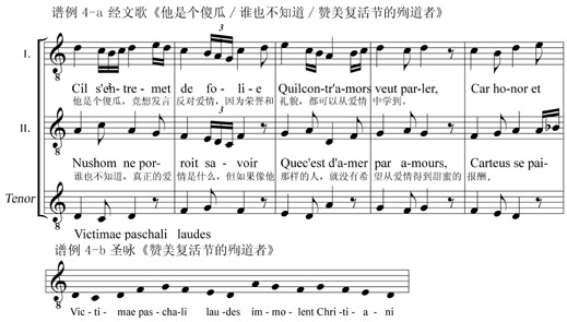 神学占统治地位的中世纪,音乐中的感情表现受到遏制,宗教音乐的结构形式超过了情感表达的需要,但依然体现了理性与非理性的对立统一。谱例4-a是经文歌《他是个傻瓜/谁也不知道/赞美复活节的殉道者》, [[3]]459低音声部(Tenor)使用了圣咏的旋律(谱例4-b圣咏《赞美复活节的殉道者》),圣咏贯穿该作品始终,格里高利圣咏是用教会调式写作的单声部旋律,来自圣经的歌词是同上帝交流的媒介,充分体现着宗教理性,但高音声部Ⅰ与高音声部Ⅱ的歌词却是世俗的爱情内容,非宗教性旋律也是独立创作的,这体现理性与非理性的对立统一。另外,教会调式以五度相生律为基础,感性本能向以自然泛音为基础的纯律滑去,五度相生律最终被纯律所取代,教会调式最终被大小调式体系所取代,这一现象的背后是感性与理性的冲突,大小调式体系的胜利是感性冲破理性束缚的胜利。