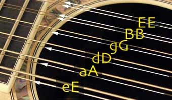 十二弦吉他的琴弦实际是由六组复弦组成的,每组两根琴弦,所用琴弦也和六弦吉他一样。各组琴弦的定音(由低到高)分别为: 6弦3弦、5弦2弦、4弦1弦、3弦3弦、2弦2弦、1弦1弦。其定弦方法和六弦吉他类似,其中前三组的3弦、2弦、1弦的空弦音分别比6弦E、5弦A、4弦d高八度,而后三组每组的两根琴弦的空弦音都是同度,分别为:g、b、e1。