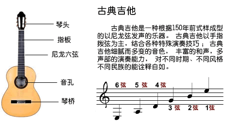 古典吉它:弹古典吉他的,显得比较沉稳有气质,是大多数MM所亲睐的类型。古典吉他乐曲一般比较优美动听,弹奏起来难度要大一些,指法跨度较大,一首曲子一般耗时比较长,弹奏的好的话,往往能够引人入胜,冲击人得心灵。相比较于其它类型的吉他,古典吉他指板较宽,便于作复杂的指法;使用尼龙弦,不像有的调的较紧的民谣钢弦那样勒指头;有十二个品格,主要用于演奏乐曲。著名的曲目有《雨滴》《月光》《西班牙斗牛曲》《樱花》等,相信大家已经能够耳熟能详。传统的古典吉他是没有背带钉的。