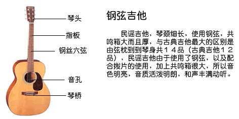 民谣吉它:提起《同着的你》《乡村路带我回家》,相信你一定熟悉的不得了,这就是典型的民谣风格的吉他歌曲。民谣吉他听起来比较朴实真挚,主要用于为民歌和乡村音乐作伴奏。民谣吉他一般不需要太多人合奏,一个人就可以自弹自唱。民谣吉他常常配以口琴、手风琴等,很简单很清新,俗话称“爱情冲锋枪”。(如果你追MM的时候唱一首《流浪歌手的情人》,相信会立竿见影的有冲锋枪的效果)。此种吉他指板较古典吉它窄,比古典吉它多了两个品格,有些民谣吉它还在琴箱上挖去一角,这有利于其演奏高音。(个人认为,买吉他最好不要买这种缺角的,这种形状或多或少会影响音质,一般是低音部分音质不好)。大多数民谣琴还在音孔下方加了护板,可以在扫弦和敲击节奏时保护琴体免受刮擦。使用钢丝弦。可以用指弹,也可用拨片,演奏方式较为自由,琴箱一般要比古典的大一点。琴底部一般有背带钉便于安装背带。