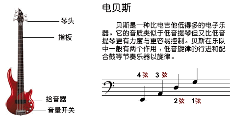 电贝司:贝斯一般是在月队里为乐曲配低音的。有了贝斯的乐曲会显得丰满一些,为其他乐器作了铺垫。记得以前听过一段摇滚贝斯,弹的极为有力量,感觉极雄壮。贝斯高手的演出,常常会让人叹为观止。在乐队里,贝斯可是个不可缺少的角色。我们以前没钱买贝斯,就用木吉他拆去1、2弦,其余弦统统降低一度,作为代替。