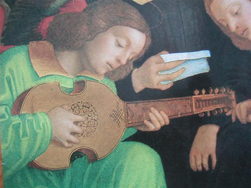 比欧拉琴(Viola)(如图),在现代意指中提琴,在意大利文艺复兴时期特指弦乐器,有时也指吉他类乐器。用为伴唱乐器已有长期传统,且后来又被称为手指比欧拉琴(Violada mano),意思是以手指弹奏而非用弓拉奏,也不是用琴拨弹奏之拨弦乐器。事实上,这种弹奏姿势直到现代,仍有部分演奏家效法模仿,以右脚踩在踏板上演奏。在十六世纪早期意大利最著名之鲁特琴与六组弦比维拉琴作曲家米兰诺(Francesco da Milano)则以正统义大利图表记谱法以及拿玻里图表记谱法,为这种乐器谱出了两套精致而有音乐价值的作品。