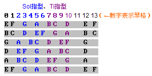 例如我们从第3格第六弦的G开始,全音推算到A,这时候不能再全音推算到B,而必须把B音放在第五弦上,那我们知道第五弦第三格是C,可以由它逆推半音到第二格的B。依照这个规则,我们可以得到另一个由G开始的指型,由於G在C大调中唱做Sol,所以这个指型叫做Sol指型: