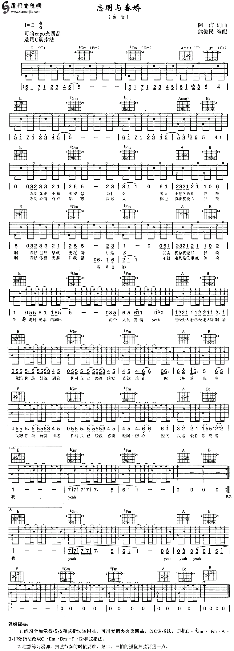 (台语)志明与春娇(五月天) 六线谱/简谱/歌词/歌谱