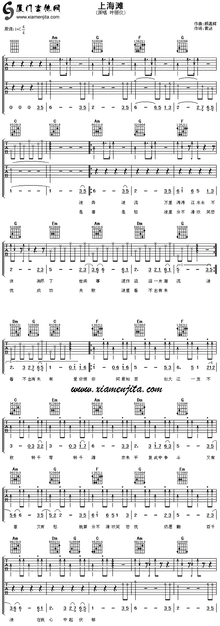 上海滩(叶丽仪) 双吉他/六线谱/简谱/歌词