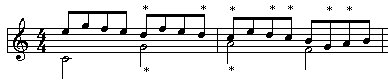 具有一定程度的学生常常会对某些音该用靠弦法还是用勾弦法感到困惑,如上例中带*的音符。其实任何事情都不是绝对的,吉他也不例外。规则是死的,它仅仅对大多数问题比较简单的情形做出规定,而音乐则是千变万化的,在许多因素综合在一起时,就要考虑规则是否适用,是否妨碍音乐的需要。实际上该用靠弦奏法而不能用的例子是很多的,如上例中带*的音符,又如分布在相邻琴弦上的和弦,复调音乐中的各个声部,速度很快很轻松很活泼的乐句等等。因此,演奏者应该顺应音乐的要求,自己决定如何弹奏。不要担心你的选择和别人的不一样,不同的演奏者采用不同的奏法是很正常的。