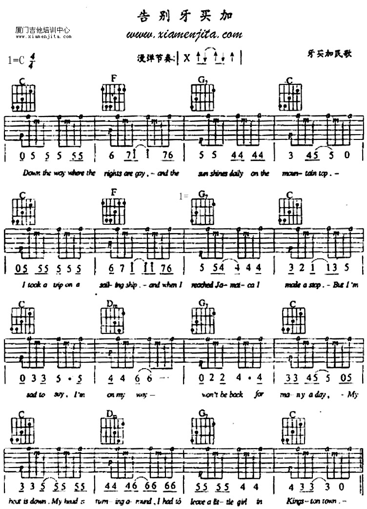 告别牙买加 Jamaica Farewell 六线谱/简谱/中英文歌词