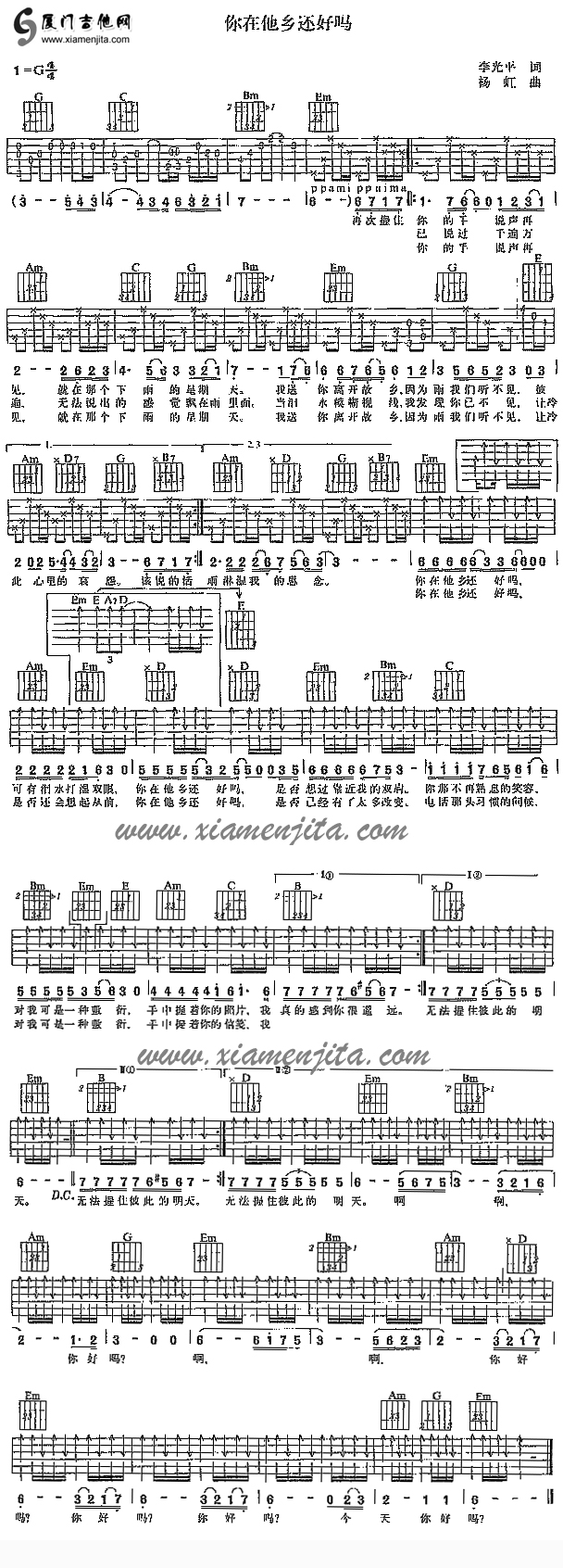 你在他乡还好吗? 六线谱/简谱